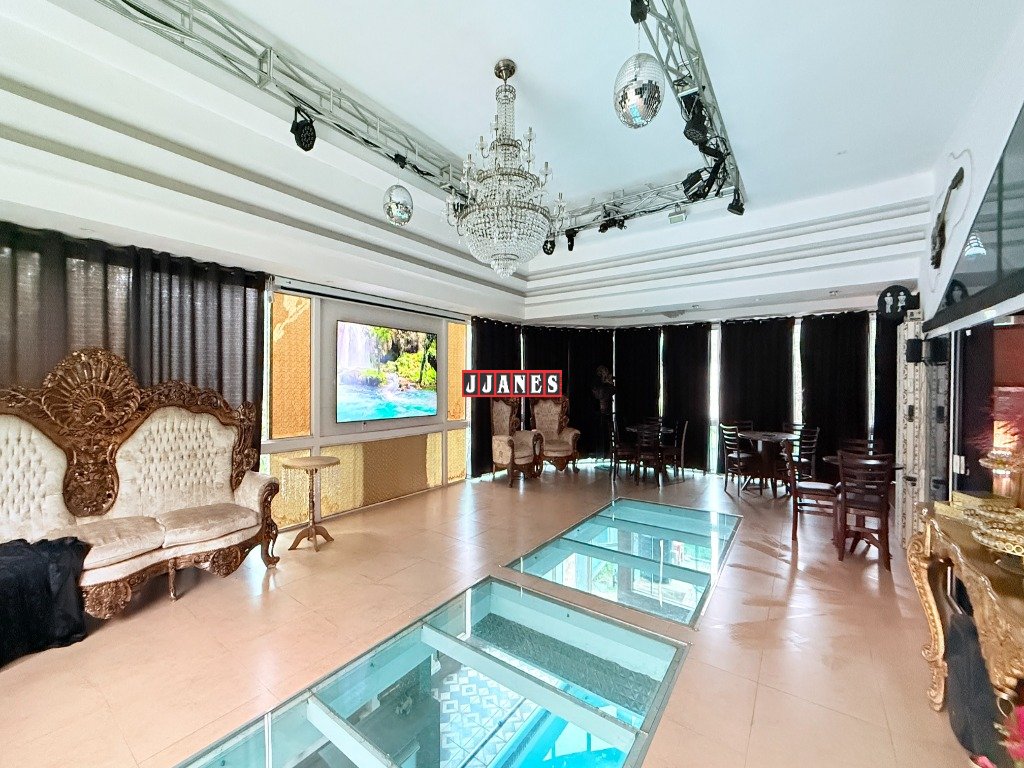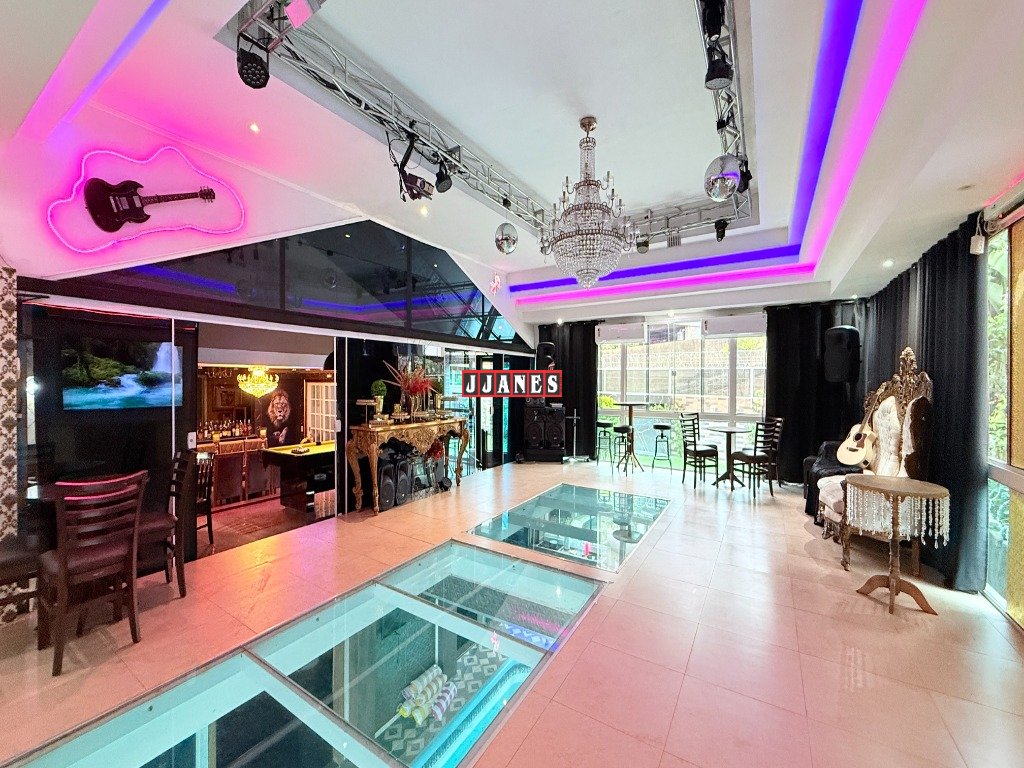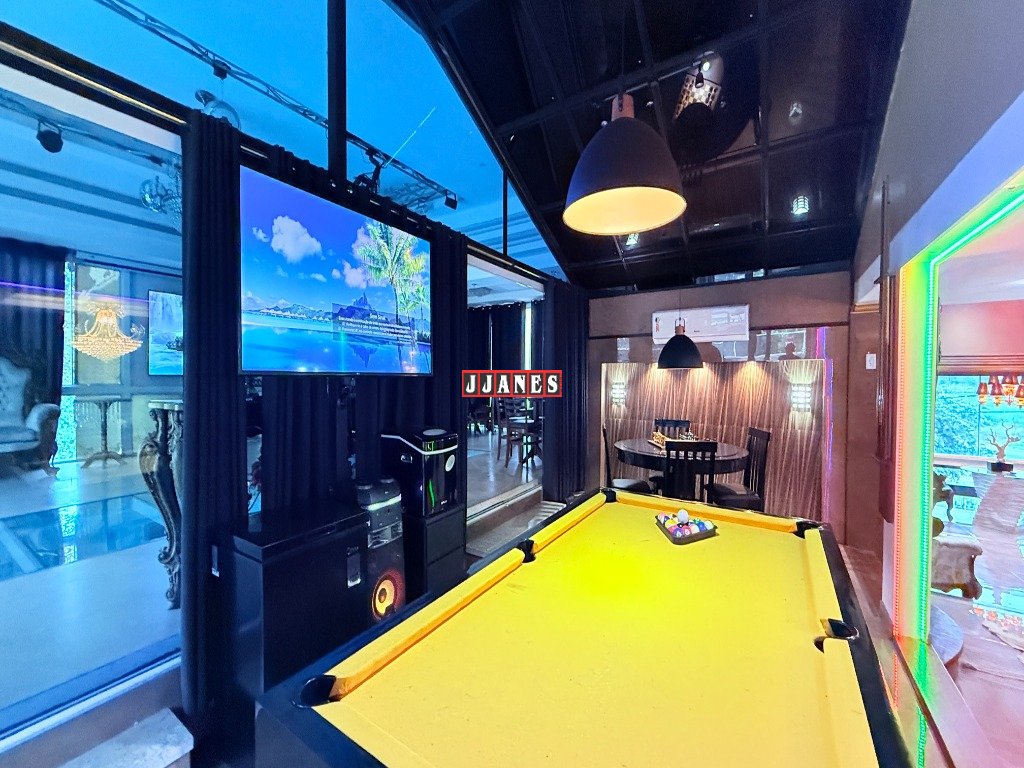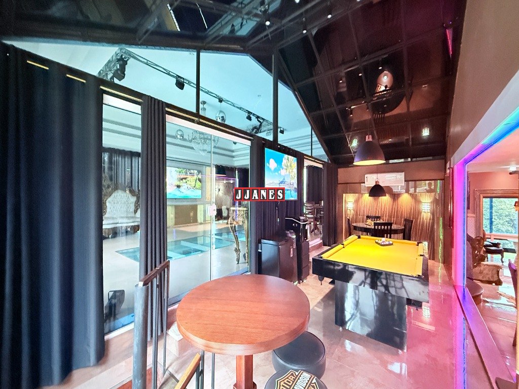 Acima do ambiente da piscina, localiza-se um requintado salão de festas para 60 pessoas com telão retrátil de 150 polegadas , controle remoto, além de Tv de 85 polegadas, sistema de som, laser profissional, luses, mesa de som, máquina de fumaça. A pista de dança é constituída de vidro especial, laminado e temperado , permitindo extraordinária integração entre ambientes(piscina piso inferior e salão piso superior).