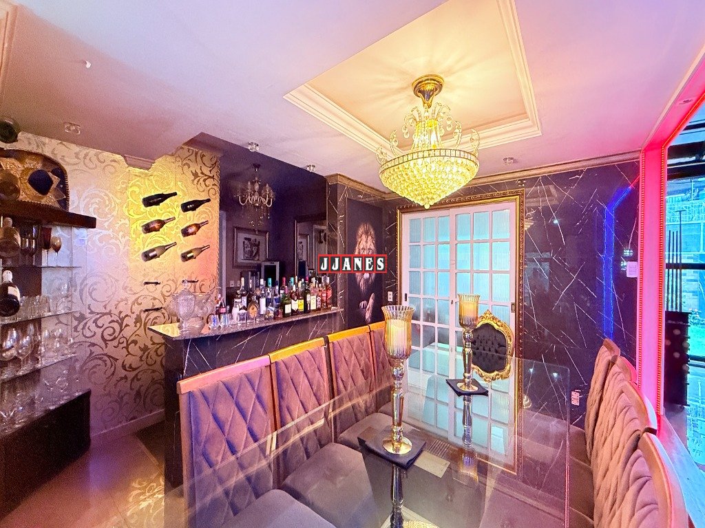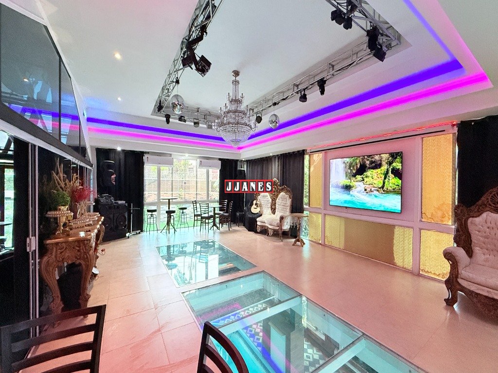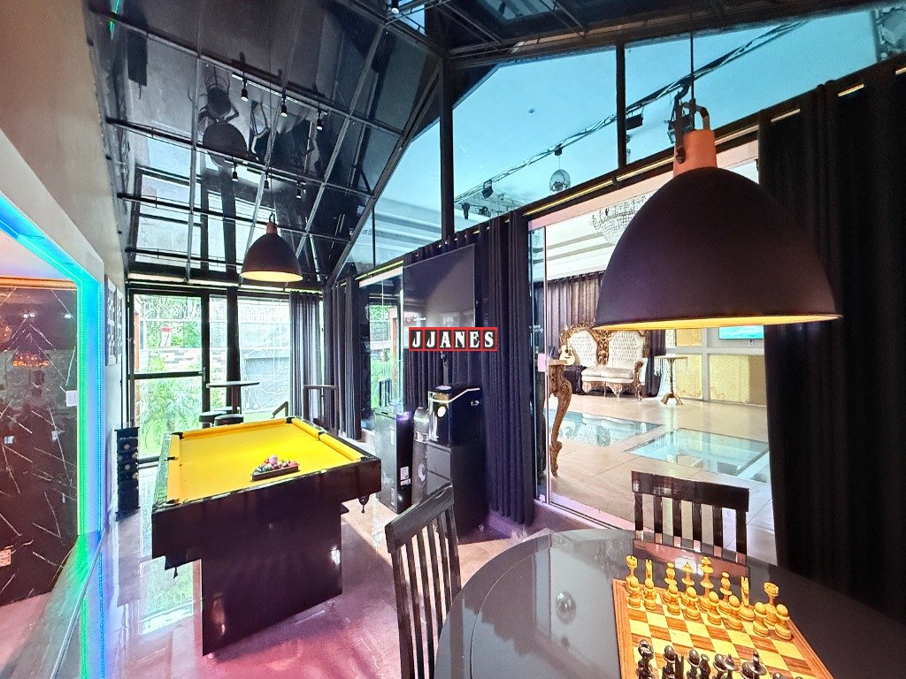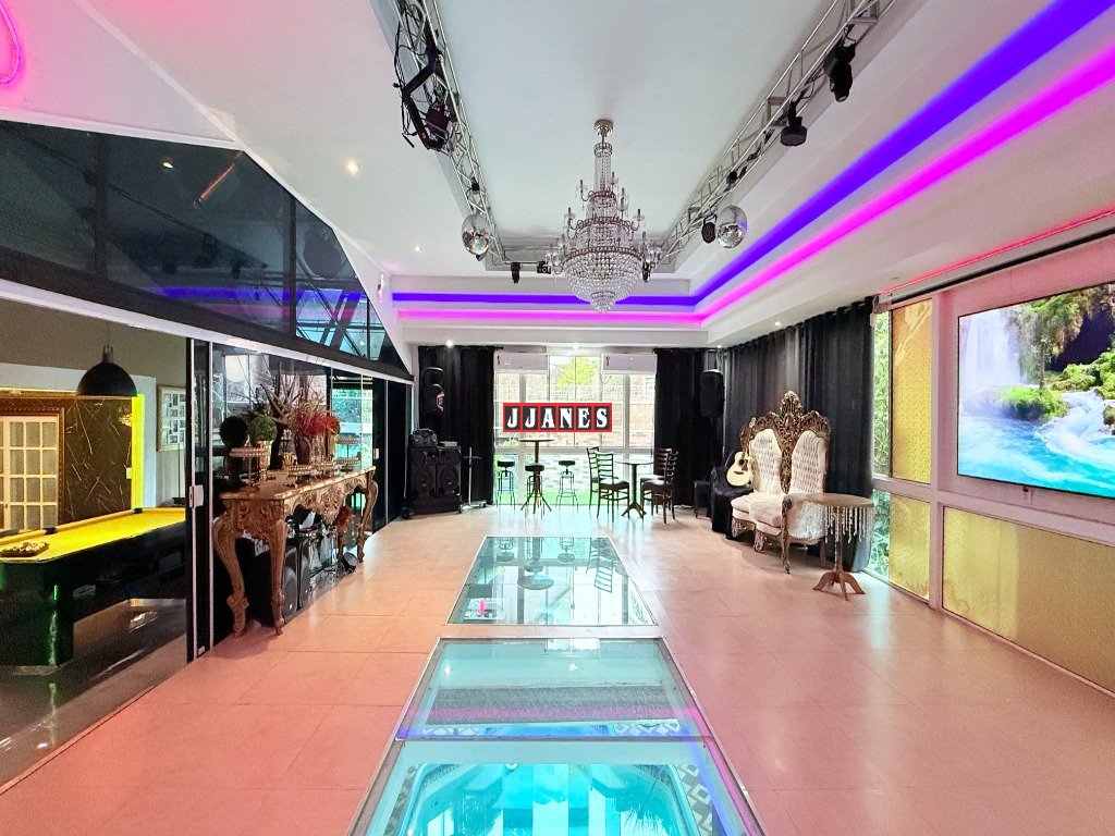 Acima do ambiente da piscina, localiza-se um requintado salão de festas para 60 pessoas com telão retrátil de 150 polegadas , controle remoto, além de Tv de 85 polegadas, sistema de som, laser profissional, luses, mesa de som, máquina de fumaça. A pista de dança é constituída de vidro especial, laminado e temperado , permitindo extraordinária integração entre ambientes(piscina piso inferior e salão piso superior).