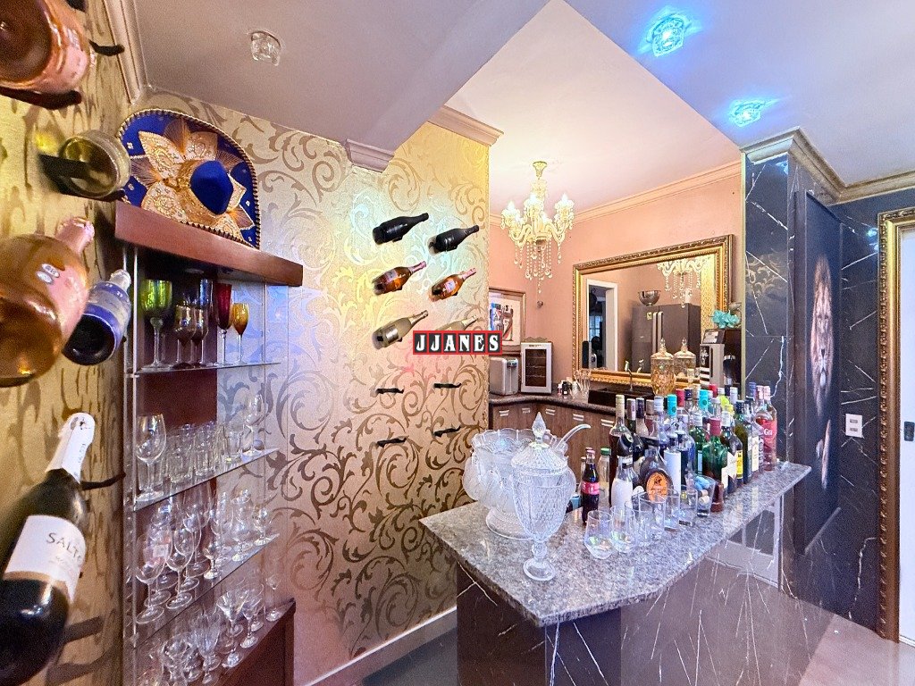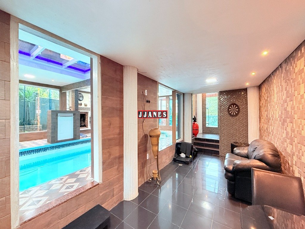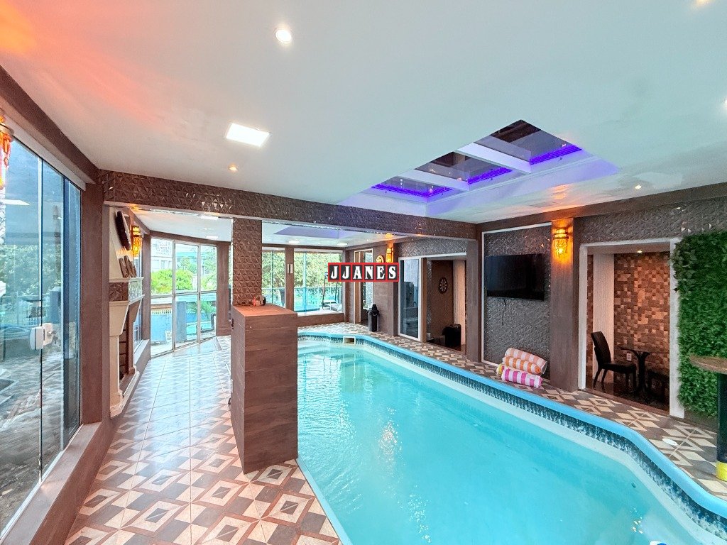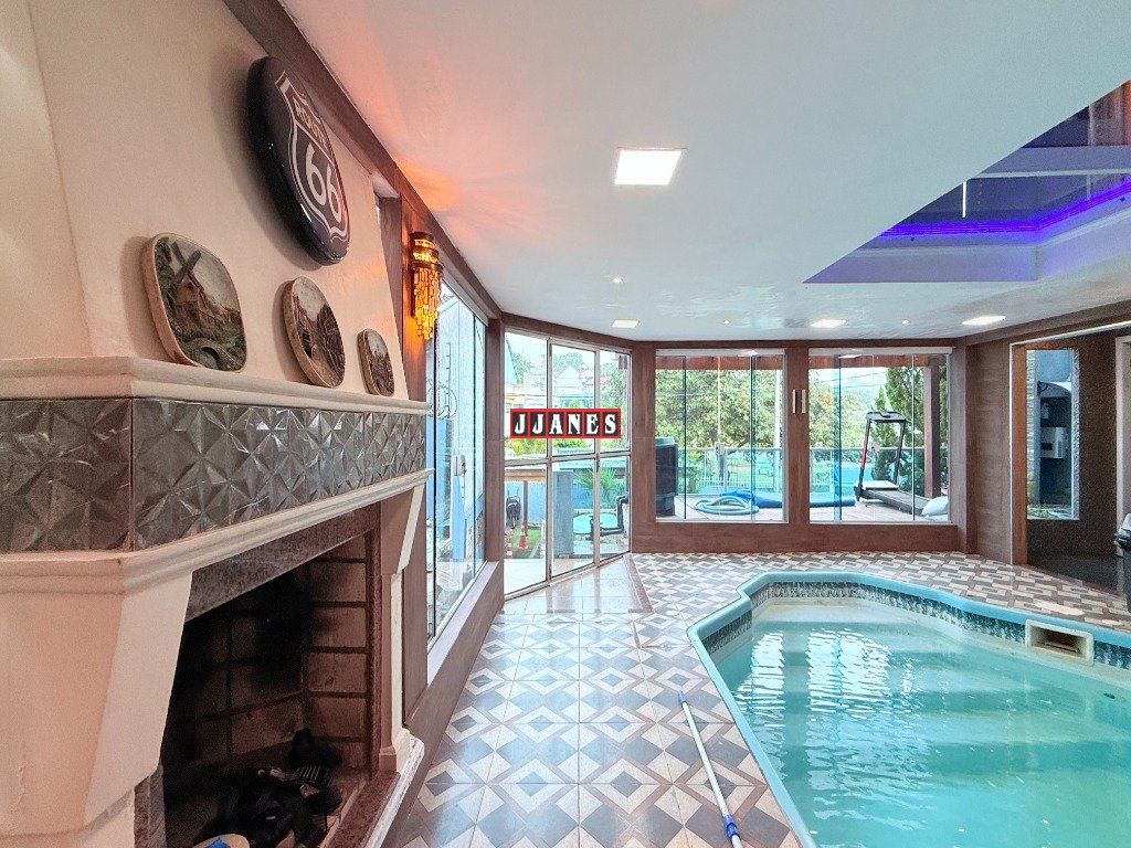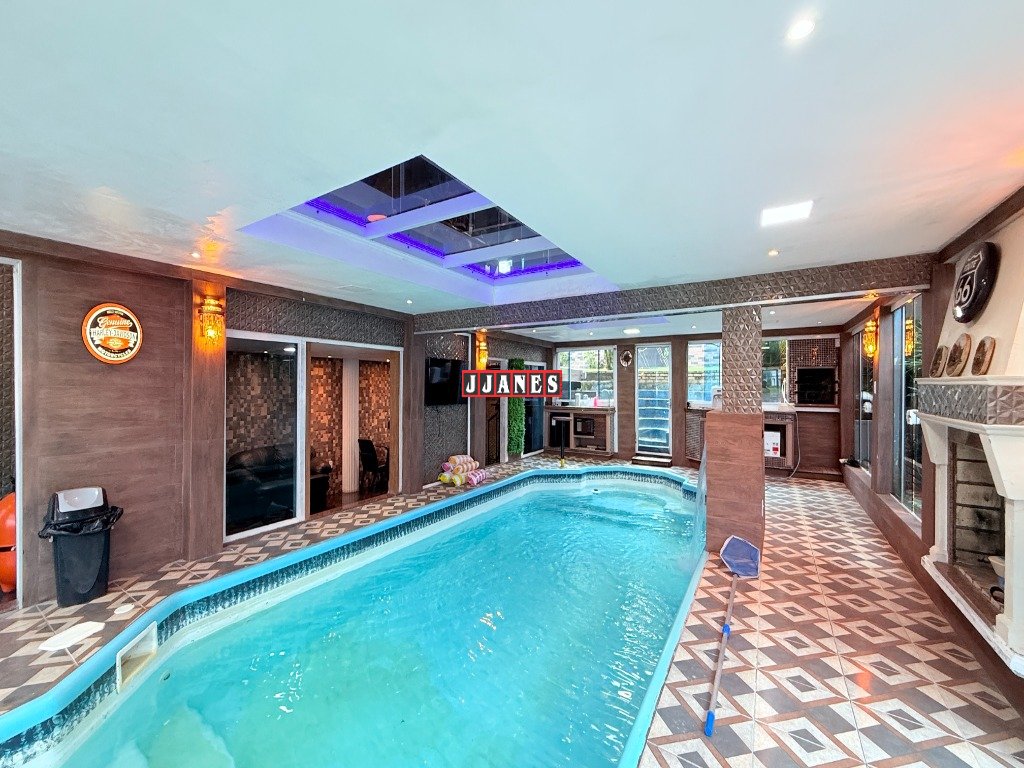Possui 4 suítes , 1 no piso principal e 3 no piso superior, 7 banheiros , piscina interna aquecida de 45 mil litros, com cascata, em ambiente de aproximadamente 100 metros quadrados (com churrasqueira e lareira).