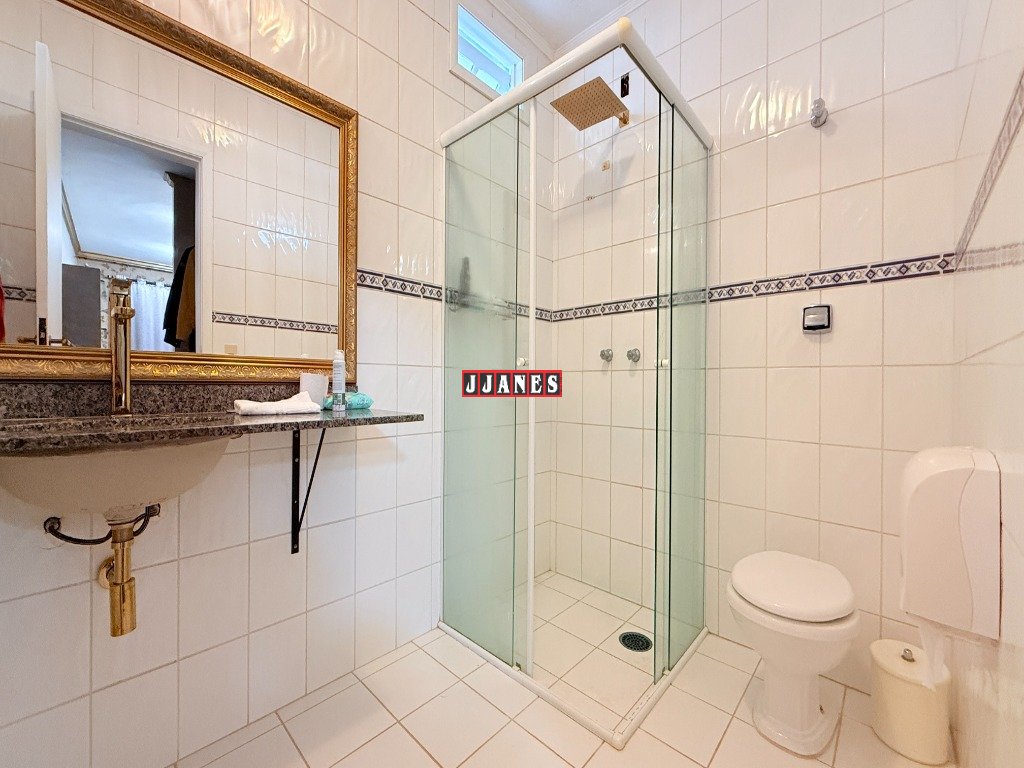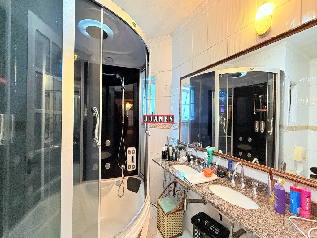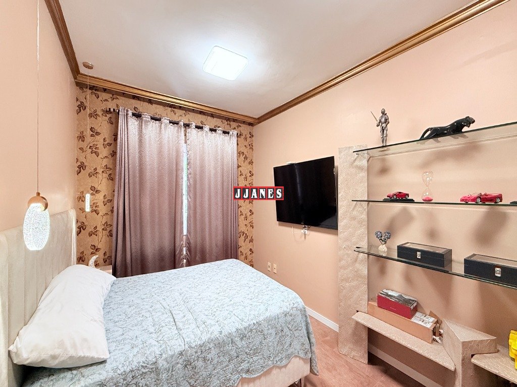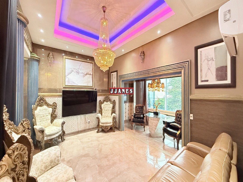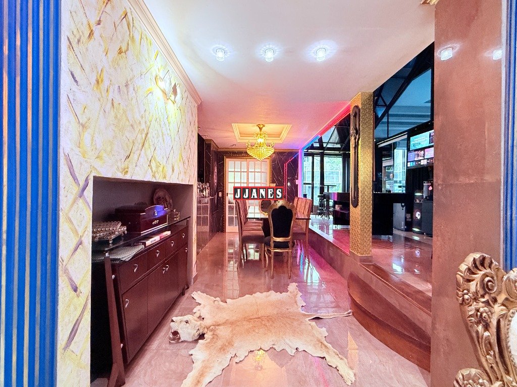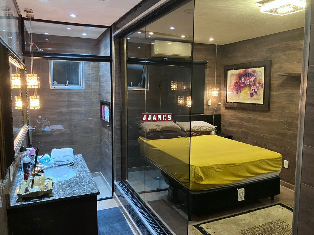 Possui 4 suítes , 1 no piso principal e 3 no piso superior, 7 banheiros , piscina interna aquecida de 45 mil litros, com cascata, em ambiente de aproximadamente 100 metros quadrados (com churrasqueira e lareira).