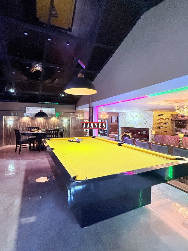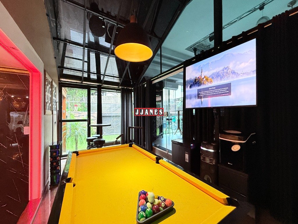 O espaço de sala de jogos, também em conceito aberto com sala de jantar, oferece uma mesa de bilhar e uma de carteado, ambas em laca, com som e Tv de 60 polegadas.