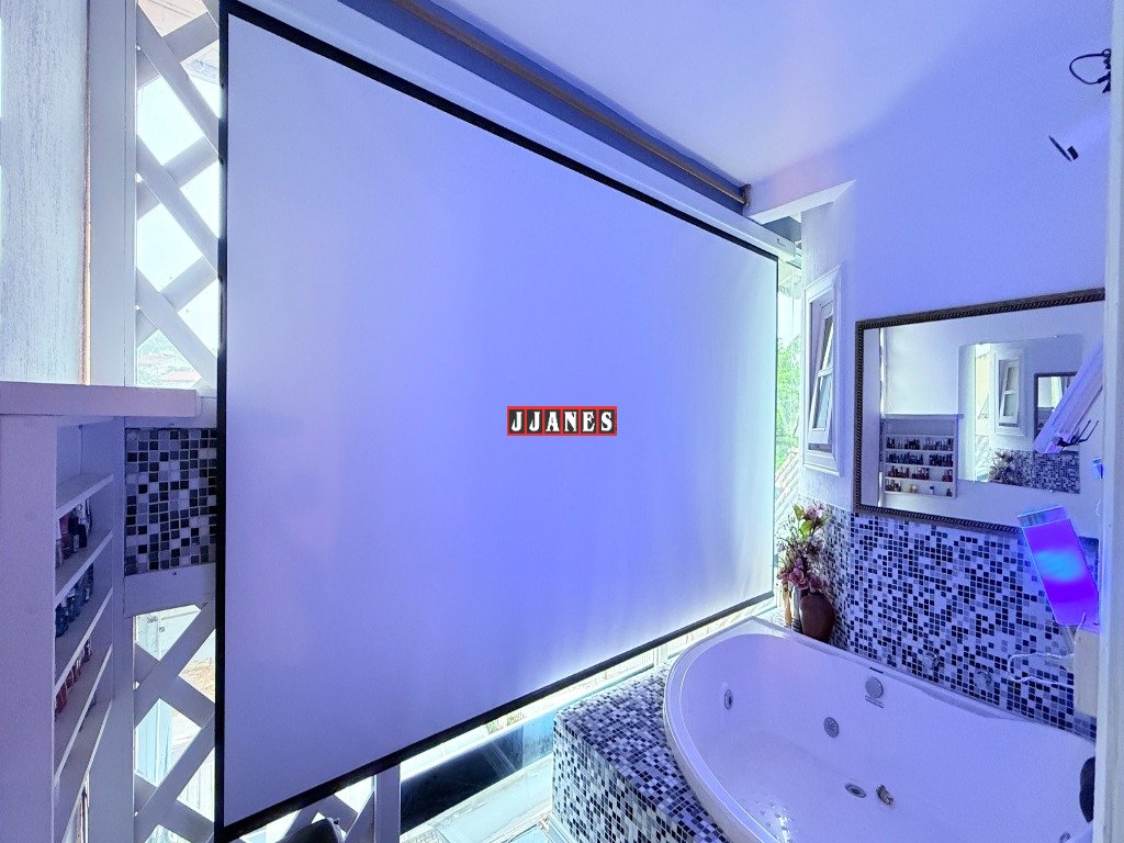 Espaço de relaxamento independente com banheira de hidromassagem no piso superior, próximo das suítes, com vista para o por do sol. O ambiente conta com um telão retrátil de 150 polegadas, com controle remoto.
