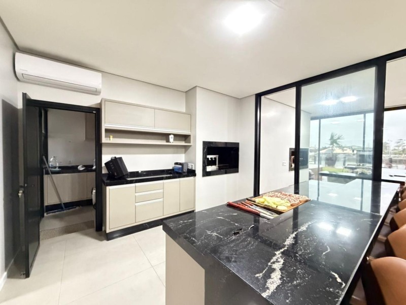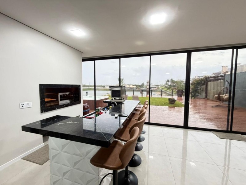 NIÍVEL DA RUA: Amplo Living ( sala de estar com lareira, jantar, cozinha americana com churrasqueira rotativa; espaço gourmet com mais uma churrasqueira rotativa, com vista para Marina) 1 suite térrea, lavabo, banheiro social; lavanderia; jakuzi