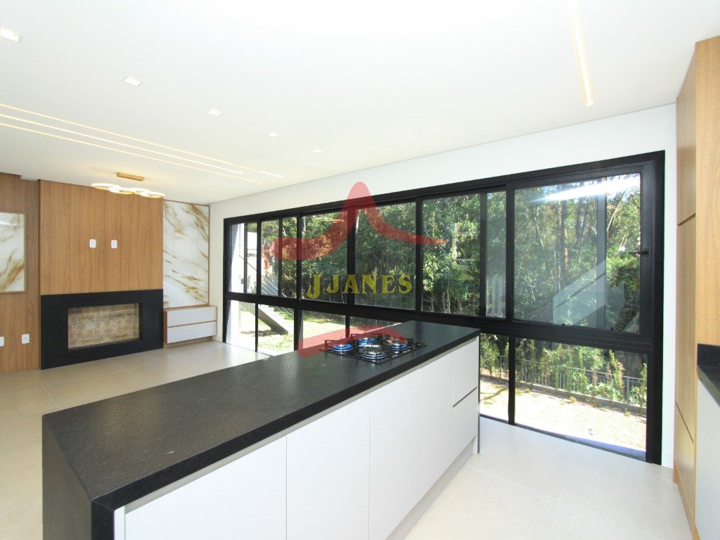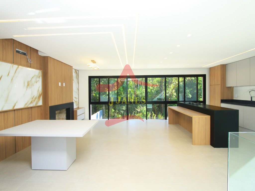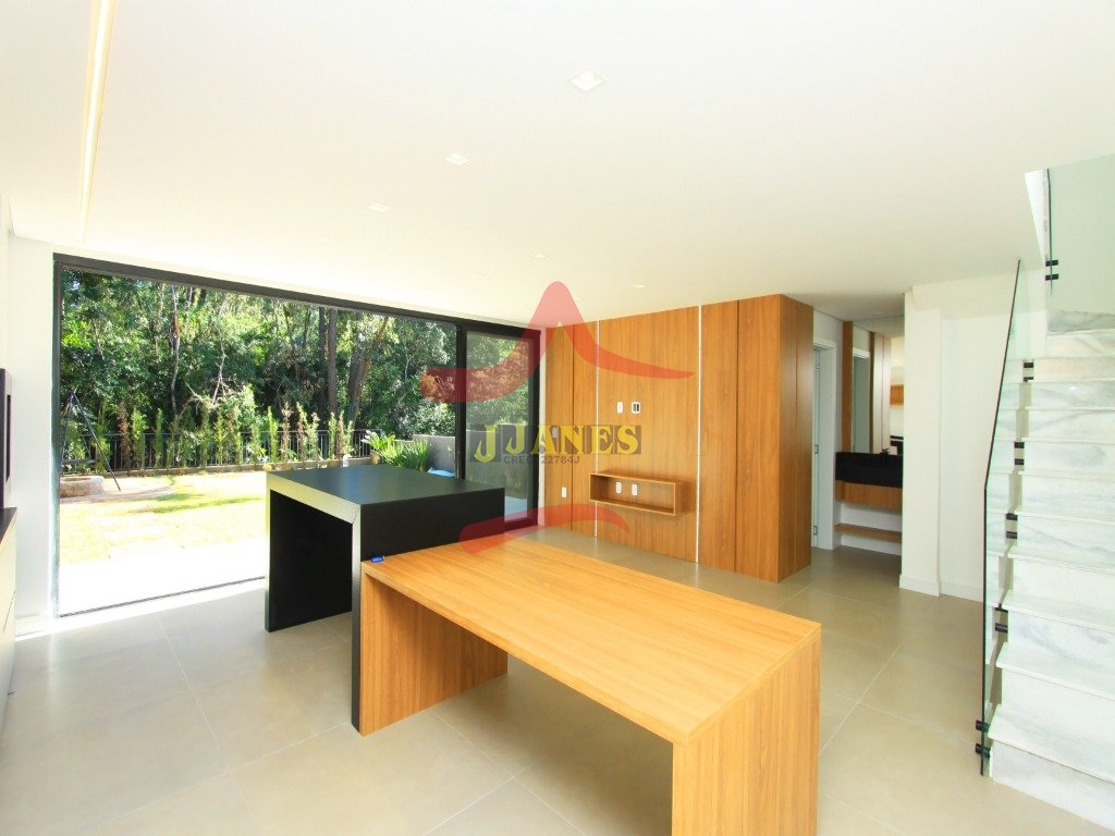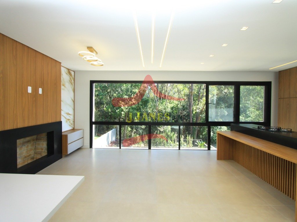 O pavimento térreo conta com hall de entrada com pé direito duplo, lavabo, sala de estar com lareira, sala de jantar, cozinha integrada e grande área envidraçada com vista para mata nativa. Garagem coberta para dois automóveis com acesso lateral para maior comodidade ao abastecer a residência com suas compras.