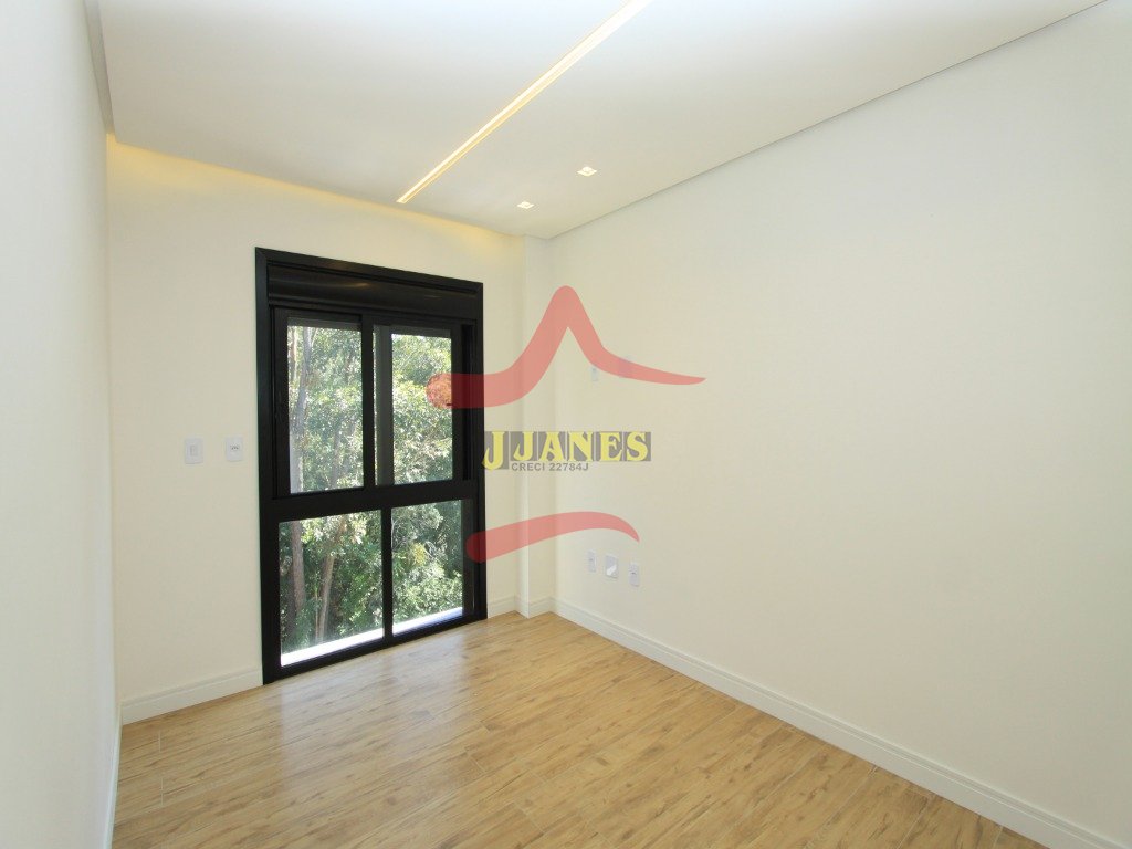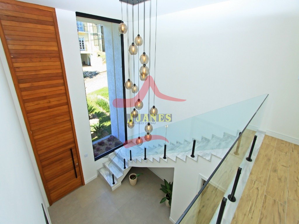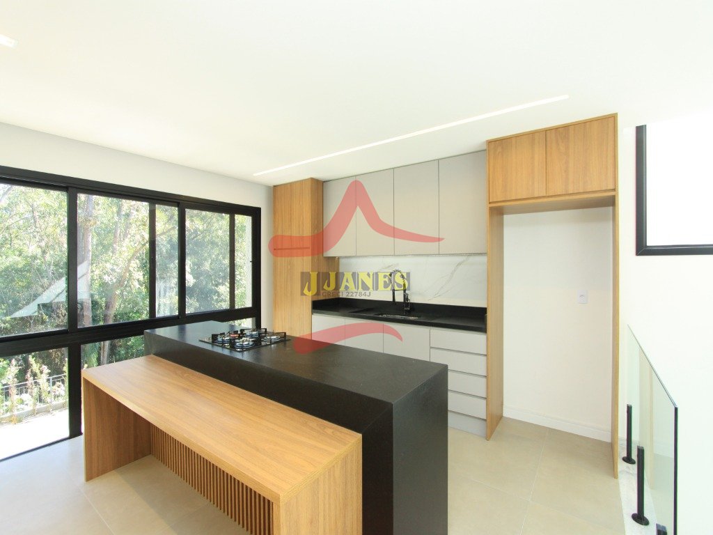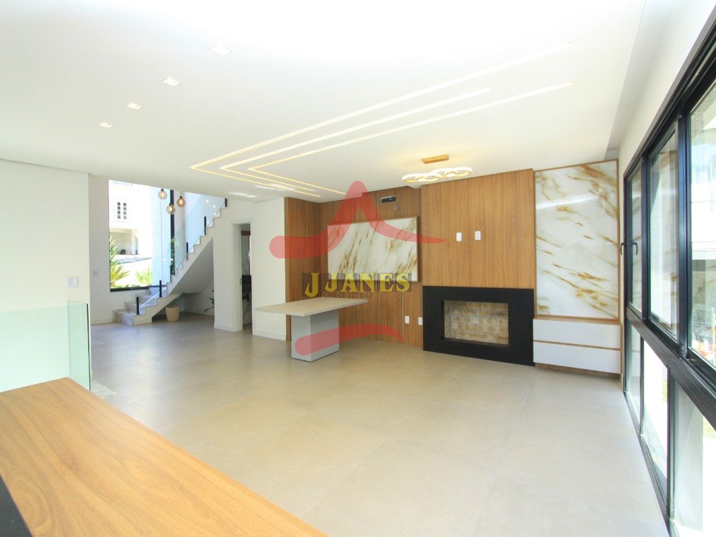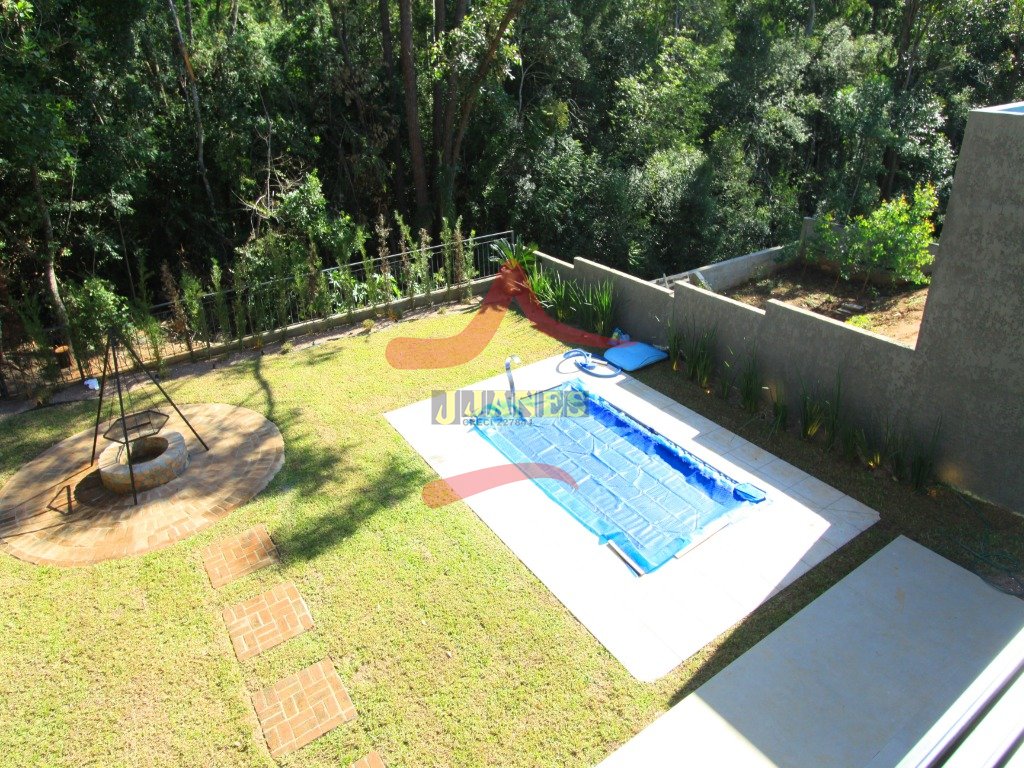 O pavimento térreo conta com hall de entrada com pé direito duplo, lavabo, sala de estar com lareira, sala de jantar, cozinha integrada e grande área envidraçada com vista para mata nativa. Garagem coberta para dois automóveis com acesso lateral para maior comodidade ao abastecer a residência com suas compras.
