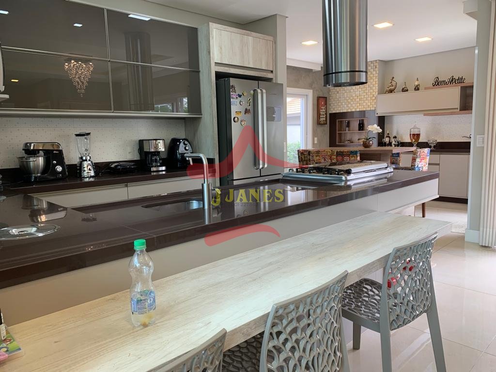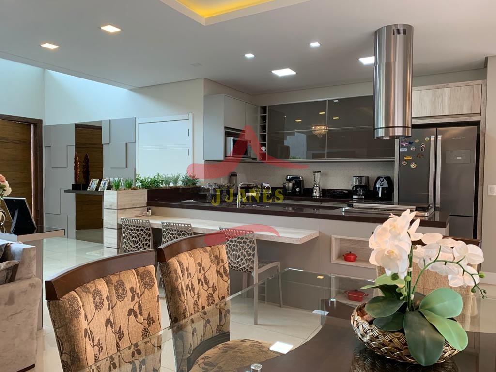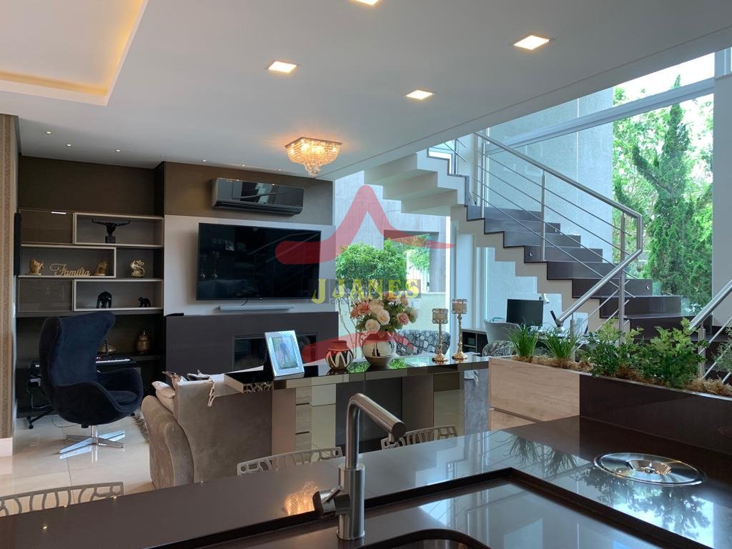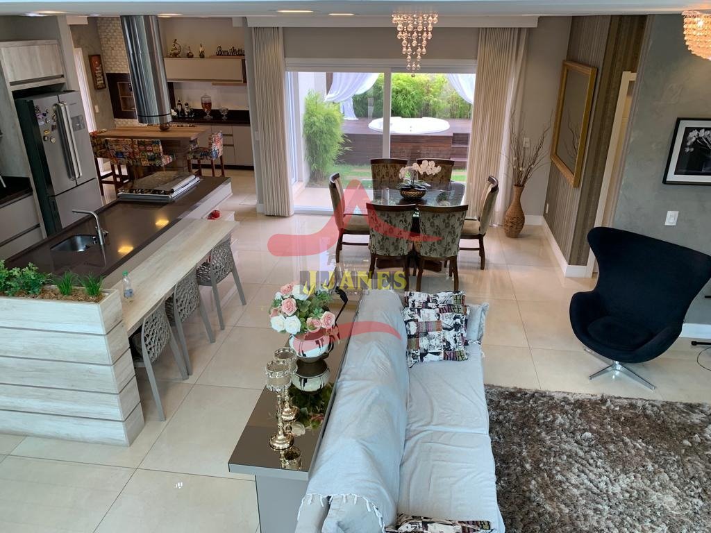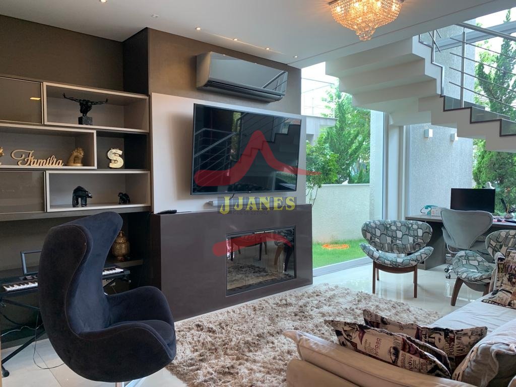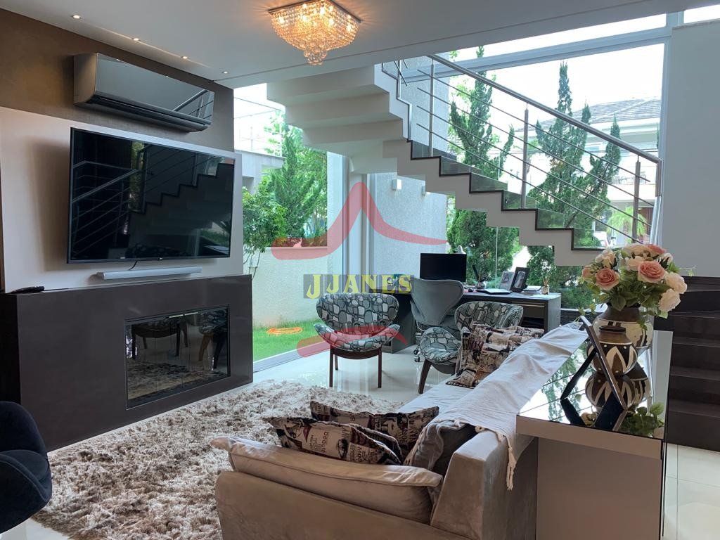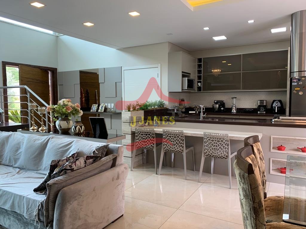Estar com pé direito duplo e lareira, jantar, cozinha americana, gourmet, lavabo, lavanderia, Home Office.