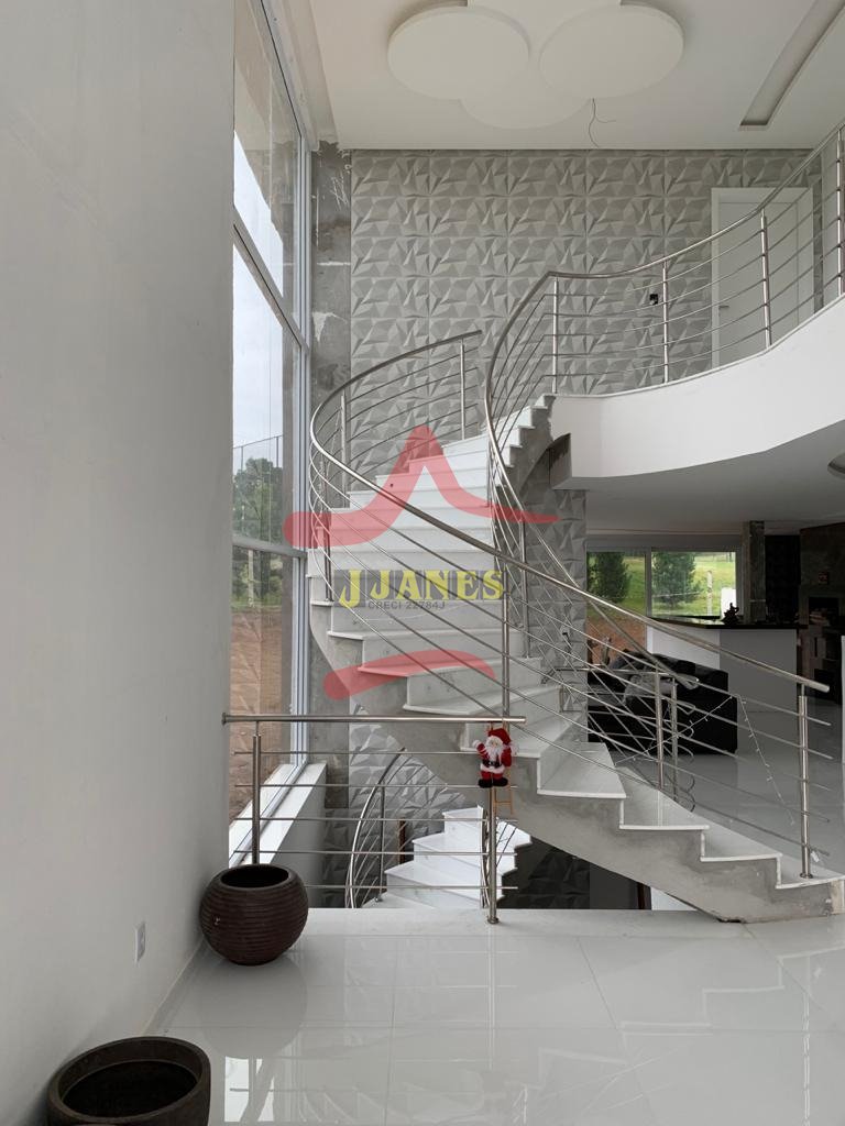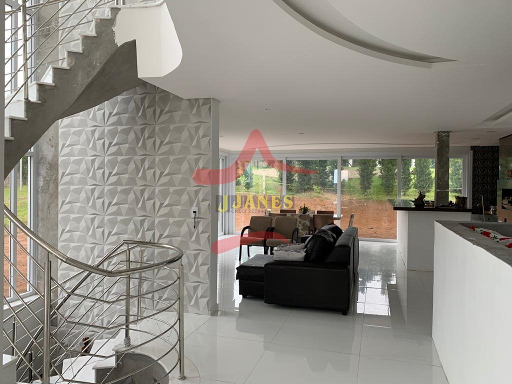 1º. PAVIMENTO: Amplos ambientes integrados, Hall, sala de estar com pé direito duplo; sala de estar com lareira; sala de jantar; cozinha americana; gourmet com bancada ; 1 suíte com sacada, banheiro social.