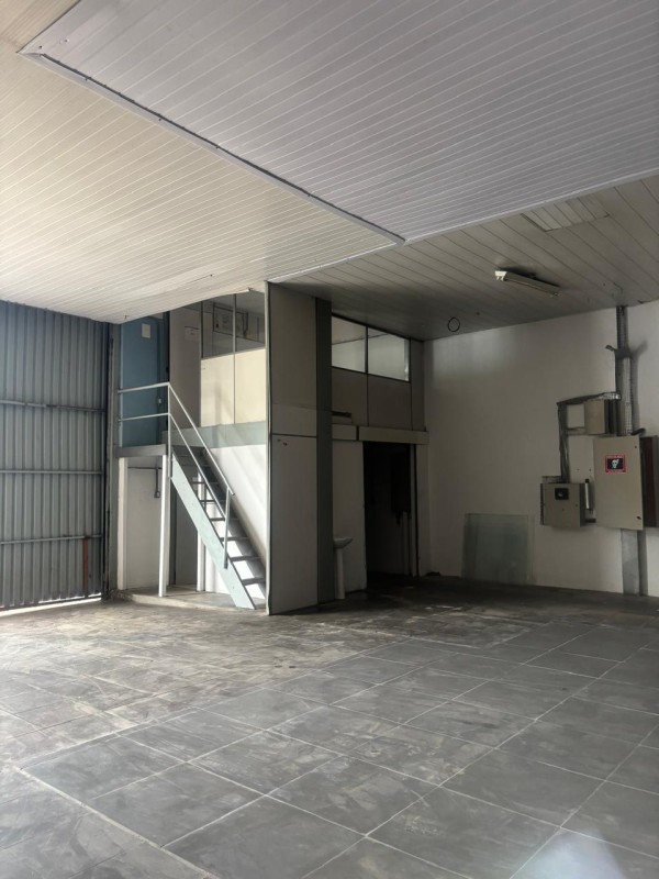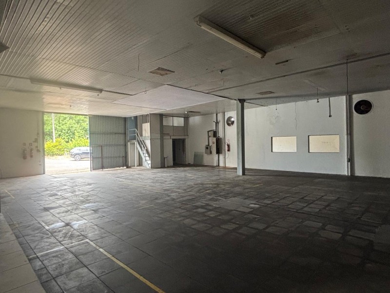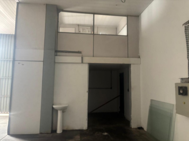 O imóvel conta com banheiro social e mezanino com escritório, oferecendo estrutura funcional para área administrativa.